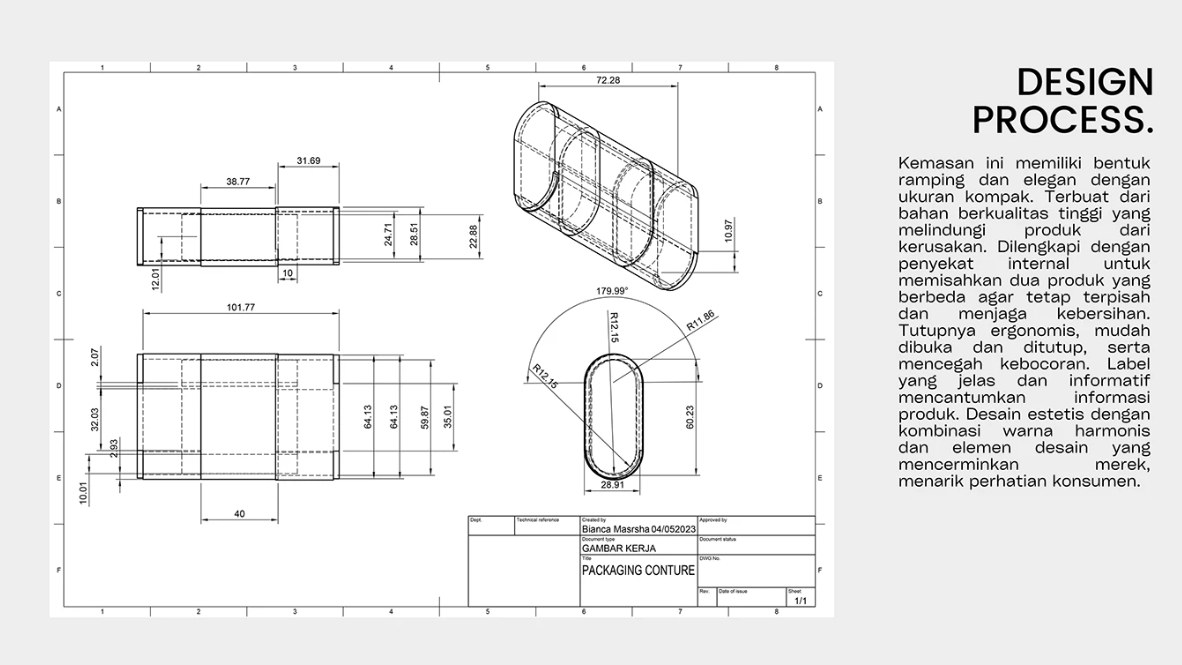 Every dimension was drawn before it was lit. The technical sheet (Packaging Conture, Bianca Masrsha, 04 May 2023) locked the case length, the divider wall thickness, the cartridge clearance, and the gold end cap seat before any of the renders asked a material question.